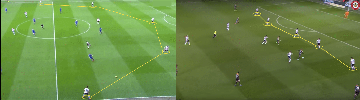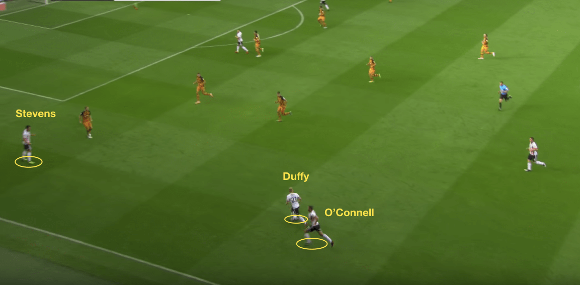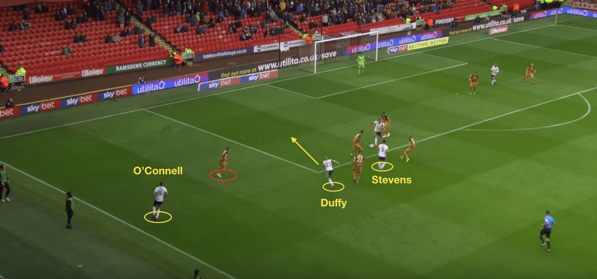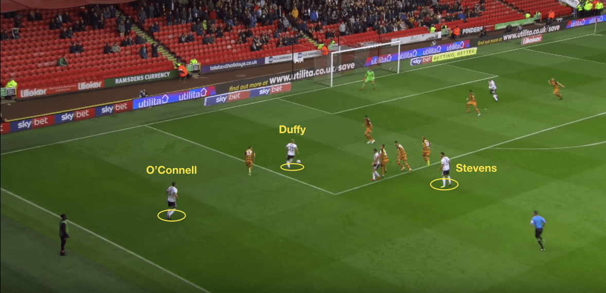 What gives them a large part of their uniqueness is the way in which their five man defence operates, and how they utilise their ‘overlapping centre backs’. When Sheffield United were resting with the ball, the wide centre halves, Chris Basham and Jack O’Connell often pulled out wide into fullback-like positions, while the wingbacks pushed forward into traditional winger positions. What then makes the ‘overlapping’ part is when Sheffield United are on the front foot, one of the the wingbacks (depending which side of the pitch the ball is on) will tend to drift into slightly more central areas to support the midfield, and often playing not too far off the strikers. This gives the wide centre-half the space to overlap, such to the extent that Basham and O’Connell often found themselves crossing it in or cutting it back from the byline. Meanwhile, the wingback from the opposite side was frequently encouraged to get forward and take up a position at the back of the area, to provide numbers in the box. Having the centre-backs run from such deep positions make them difficult to track for opposing midfielders, and therefore made it such an effective tactical ploy. While the wide centre backs and the wingbacks ventured forward, usually one of either Fleck or Norwood would drop in deep to cover while the central centre back, John Egan stayed back at all times.